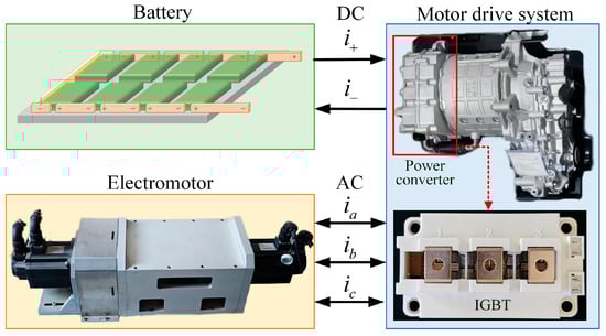 Figure 1, consisting mainly of a battery, power converter, and motor. When the system operates the motor, the power converter works in the inverter state, converting the electric energy from direct current (DC) to alternating current (AC) and delivering it to the motor. Conversely, when the system is in a braking state, the motor operates in generator mode, outputting three-phase AC to the power converter. At this time, the power converter works in a rectifier state, converting the three-phase AC into DC and storing it in the battery. Therefore, during the operation of the motor drive system, the power converter continuously alternates between rectifier and inverter state.