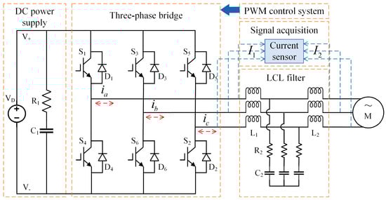 c), flows through the LCL filter—comprising an inductor-capacitor-inductor configuration—before being supplied to the motor. The LCL filter comprises inductors