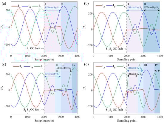 ◦ interval, overlapping occurs when a dual OC fault happens in the same half-bridge. Based on the distinct distortions, the three-phase current waveform is divided into four segments. Segment I is affected only by