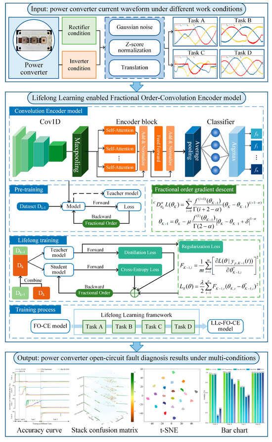 Although neural networks exhibit high accuracy in fault diagnosis, when the operating state of the power converter changes, the neural network model needs to be retrained on new fault features, which leads to a decrease in diagnosis accuracy. Therefore, this paper proposes a lifelong learning-enabled fractional order-convolutional encoder model that can continuously learn the open-circuit fault characteristics of the power converter under multi-conditions. This model maintains high diagnostic accuracy for all faults, highlighting its significant research implications and practical applications. The contributions of this paper are as follows: