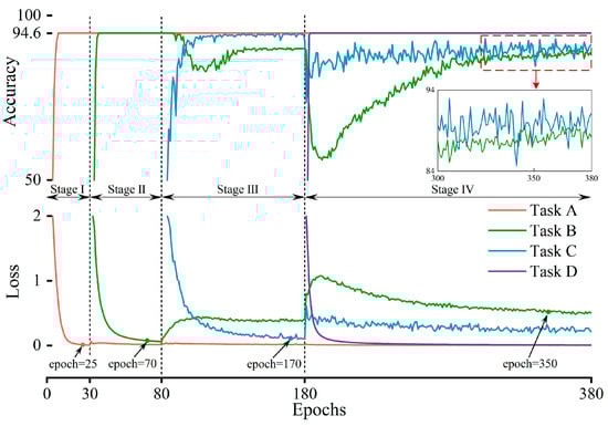3. A multilevel lifelong learning framework is designed to enable the model to continuously learn from new fault samples. Limit the range of updates during which the model parameters learn new tasks by incorporating a resilient regularization penalty term into the loss function. In addition, a random small number of samples from previous tasks are inserted into the new fault samples and by learning the soft labels from earlier tasks to improve the stability and accuracy of the model under different tasks.