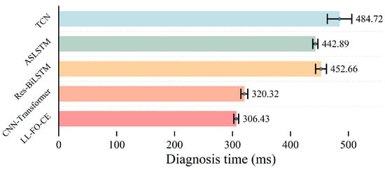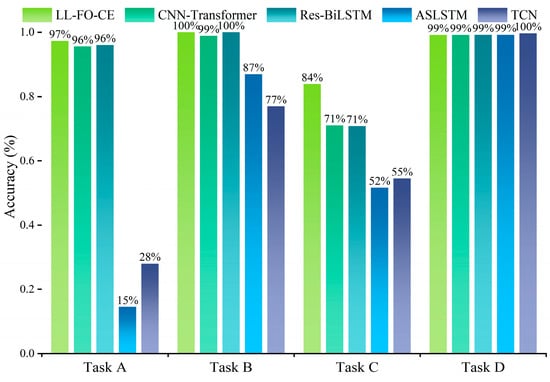 For Task D, the accuracy of LL-FO-CE, CNN-Transformer, Res-BiLSTM, ASLSTM, and TCN are 98.5%, 98%, 97.1%, 94.3%, and 92.9%, respectively. The precision scores are 98.6%, 98.1%, 98%, 92.1%, and 92.3%, respectively. The recall scores are 98.5%, 98%, 97.1%, 90.8%, and 92.4%. The F1 scores are 98.5%, 98.1%, 97.6%, 90.8%, and 92.2%, respectively. All models demonstrate improved performance on this task because Task D is the final task to be learned. However, the presence of disturbances in the fault sample waveforms results in a certain degree of degradation in the diagnosis performance of the other models. LL-FO-CE enhances the backpropagation optimization process through fractional order derivatives, which are highly robust, thereby maintaining superior diagnosis performance compared to other SOTA models when applied to actual fault waveforms with disturbances.