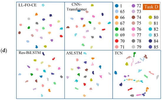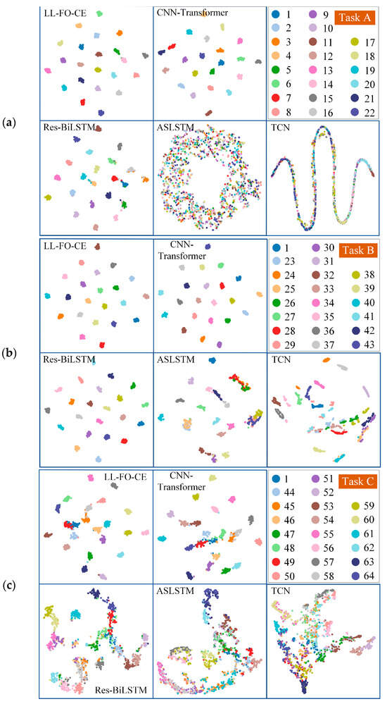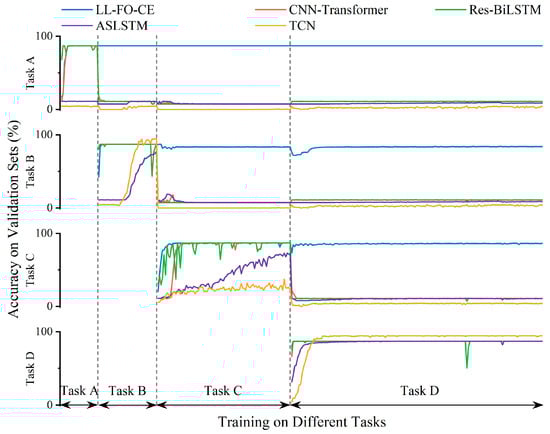 For Task A, Task B, and Task C, the accuracy of LL-FO-CE is 92.9%, 94.5%, and 87.9%, respectively, which shows the best performance among all models. The precision, recall, and F1 scores also represent the highest values across all models, indicating strong diagnosis accuracy and fault identification capability. In contrast, the other models struggled with fault recognition and diagnosis on the validation set for the first three tasks. This limitation arose because they could not maintain long-term memory of different tasks and gradually forgot the knowledge of previous tasks while continuously learning new tasks.