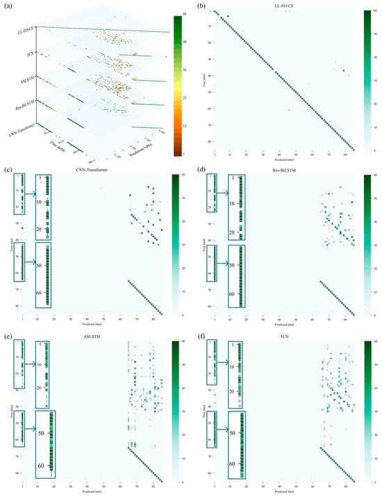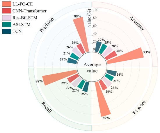 Figure 17 illustrates the overall average of 10 predictions made by each model across all tasks in the validation set. The different colored areas represent various metrics, while distinct colored bars indicate different models. For all 85 fault categories, LL-FO-CE demonstrates optimal performance across all metrics, achieving an average diagnosis accuracy of 93%. The other models, which can only perform better on Task D, exhibit performance averages ranging from 20% to 30% across all tasks. This figure visualizes the performance disparity between the proposed model and other SOTA models in the validation set, highlighting the advantages of the proposed model in diagnosing power converter faults under varying conditions.
