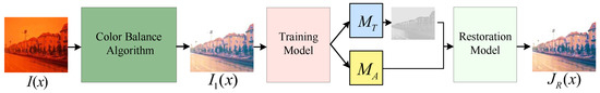 In this section, we introduce the proposed image restoration framework based on the atmospheric scattering model (see Figure 1). This framework includes the adaptive sand-dust image color cast balance method, which is a zero-shot neural network learning model that combines sharp images, transmission, and atmospheric light, and the image restoration process. The following sections provide a detailed introduction.