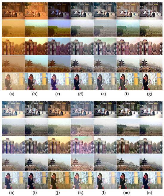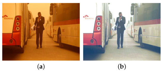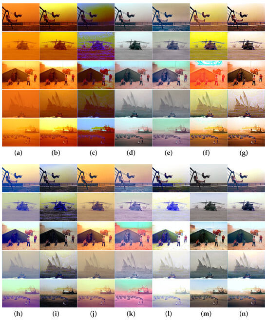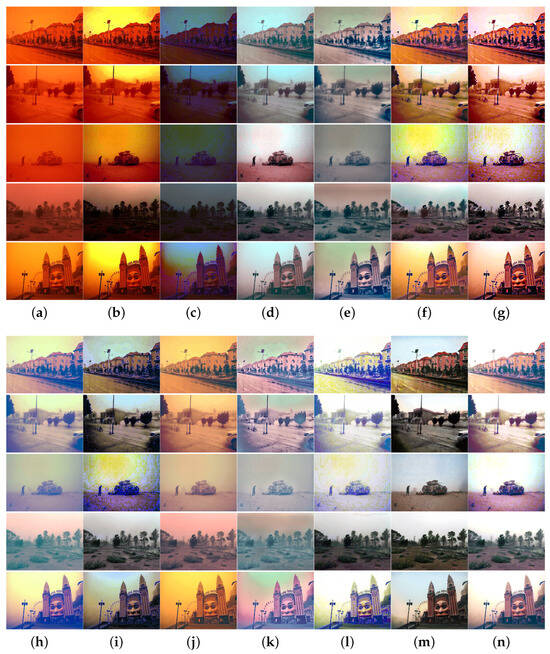 Many sand-dust image enhancement and restoration algorithms have been proposed and can be broadly categorized into three categories: (1) image enhancement methods, (2) image restoration methods, and (3) deep learning-based approaches. Image enhancement methods encompass color space transformation and enhancement [11,12,13,14], various improved histogram equalization techniques [8,9,10,13,15], white balance and filtering approaches [15,16], singular value decomposition methods [7,17], and tensor least squares optimization methods [18]. Additionally, methods based on the enhanced retinex model [19,20] and those based on diverse image fusion techniques [21,22,23,24] have been proposed. Although these enhancement methods have achieved marked improvements in contrast and tone adjustment, they rely on various hypotheses and priors. The performance of these algorithms is influenced by the varying degrees of degradation in sand-dust images. Additionally, the color casts and sand-dust in the degraded images cannot be adequately removed.