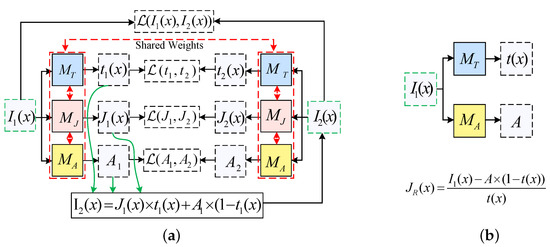 The transmission loss and the atmospheric light loss are two important loss functions, which primarily keep equal to and equal to . The transmission loss and atmospheric light loss are defined as Equations (8) and (9), respectively.