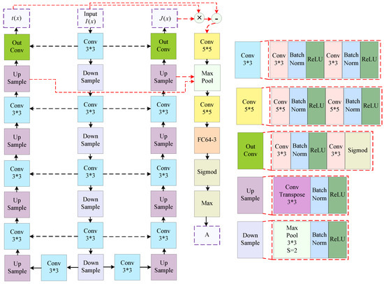 In this section, we introduce the architecture and implement the model. Figure 3a shows the zero-shot learning model framework that is proposed in this paper. Because the model is designed entirely based on the atmospheric scattering physical model, we consider that the three networks , , and are interrelated. Inspired by U-Net [47], we proposed a new model architecture shown in Figure 4, where the , , and models share weights. The transmission map estimation network located on the left side of the entire network, while the sharp image estimation network is another U-shaped network situated on the right side. The atmospheric light estimation network is designed based on Equation (4); it carries out a joint estimation by integrating the outputs of networks and together with the input image. FCM64-3 indicates converting a 64-channel image into a 3-channel image through fully connected layers. * represents convolution operation.