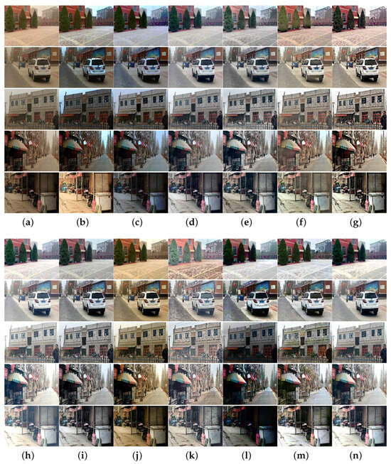 Table 1 shows the average evaluation results of the 25 images in Figure 5, Figure 6, Figure 7, Figure 8 and Figure 9. As shown in Table 1, the proposed algorithm can obtain larger e and values as well as a smaller smaller , Additionally, it consistently ranks among the top-performing algorithms in other metrics. The lowest NIQE and NPQI values obtained by the proposed algorithm suggest that the restored images exhibit superior quality and are rich in natural scene statistical feature information. Although the DIIVINE metric for RBCP, SCBCH, and TLS consistently outperform the proposed method, the subjective results are unsatisfactory, with the restored images exhibiting low brightness and the presence of sand and dust fog. The high DIIVINE scores may be attributed to the feature extraction based on statistical models and the distortion classification mechanism, which fail to fully encompass the diversity of complex visual perception. Haze and low lighting conditions can potentially “deceive” the algorithm, causing its statistical features to align more closely with the high-score patterns in the training data.