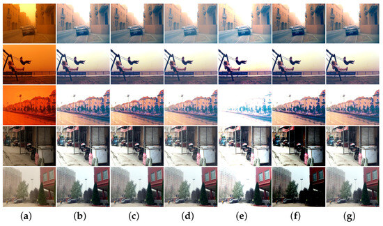 To verify the effectiveness of the loss functions used for model training, ablation experiments are conducted for different loss functions in this section. Figure 10 shows the ablation results of the loss function. As shown in Figure 10c, when the atmospheric light loss function is not used, the restored image is darker overall. As shown in Figure 10d, when the transmission loss function is not used, the fog in the recovered image cannot be completely eliminated. Figure 10e,f show that without a saturation penalty function for bright and dark pixels, the reconstructed image is either very brilliant or very dark. As shown in Figure 10g, the main contribution of the gradient loss function is to improve the fidelity of the recovered image.