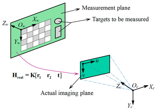 According to the theory of projective transformation, there exists a homography mapping relationship between corresponding coordinate points on the measurement plane and the actual imaging plane. This relationship can be mathematically constructed as a 3 × 3 matrix Hreal: