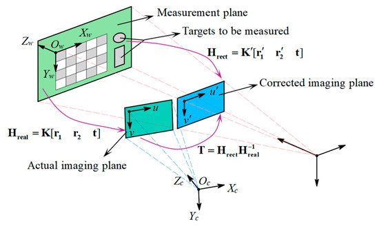 Based on the analysis in Section 2, a virtual camera is created by adjusting the actual camera’s intrinsic and extrinsic parameters. The imaging plane of the virtual camera is defined as the corrected imaging plane, which is completely parallel to the measurement plane.