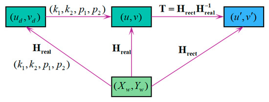 At this point, the calibration of T is realized. The whole homography relationship is shown in Figure 5. After correcting the nonlinear distortion, the perspective distorted image on the actual imaging plane can be transformed into an undistorted image on the corrected imaging plane through Equation (6).