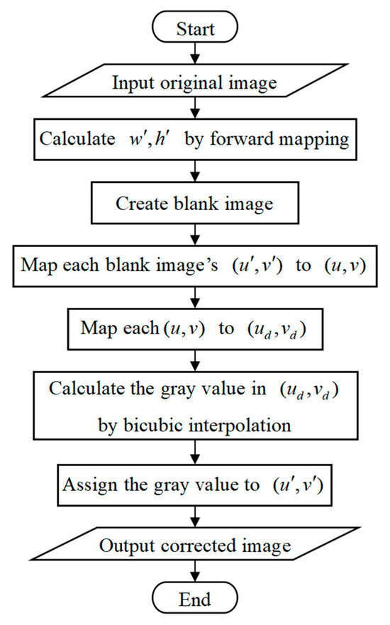 Furthermore, the reverse mapping is used to obtain the gray value of the corrected image. Begin by creating a blank image of the corrected image with a width of and a height of . For each pixel in the blank image, compute its corresponding using Equation (6). Then, apply Equations (10)–(12) to compute corresponding to . Afterward, the gray value at is obtained by the bicubic interpolation method and is assigned to . After traversing all , the corrected image can be output.