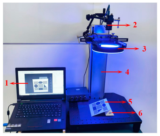 The visual measurement platform: (1) PC; (2) industrial camera; (3) ring light; (4) machine vision platform; (5) test board; (6) adjustment block.