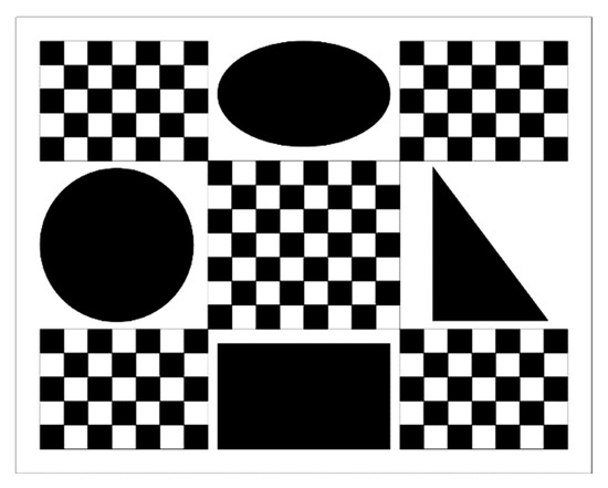 The test board is made of a 1 mm thick flat matte ceramic plate. Its pattern is shown in Figure 9, and the overall production accuracy of the pattern is ±1 µm. Each checkerboard square in the pattern is 5 mm in length, which is used to calibrate the perspective transformation model. Additionally, to avoid measurement errors caused by misalignment between the measurement plane and the calibration plane [8], four standard test patterns, coplanar with the checkboard pattern, are set on the test board to test the measurement performance of the proposed method. The circle pattern has a radius of 16 mm (labeled R16) and is used to evaluate radius measurement performance. The rectangle pattern has a length of 36 mm and a height of 22 mm (labeled L36 and H22, respectively) and is used to evaluate length measurement performance. The right triangle pattern has two acute angles of 37° and 53° (labeled D37 and D53, respectively) and is used to evaluate angle measurement performance. The ellipse pattern is viewed as an irregular planar shape with an area of 622.035 mm2 (labeled Area) and is used to evaluate area measurement performance.