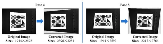 Of the nine selected images, Pose 4 and Pose 8, which have severe perspective distortion according to β and γ, were selected as examples. The comparison between their original and corrected images is shown in Figure 10.