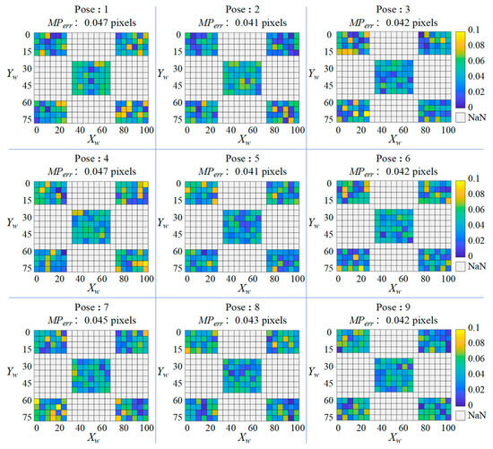 The calculation results of and for each pose are plotted as a heatmap shown in Figure 11, where the coordinates of each small square correspond to the world coordinates of each corner of the checkboard, and each square’s color represents the value of at that position.