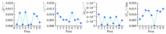 The computed extrinsic parameters of the corrected images are shown in Table 4. The computed evaluation indicators: , , and are shown in Figure 12.