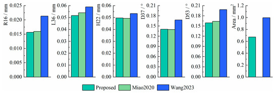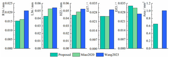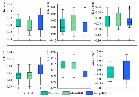 From the results, the errors of the proposed method are within [−0.03 mm, 0.03 mm] when measuring R16, which is more centralized than the other two methods. In measuring L36 and H22, the errors of the proposed method are within [−0.08 mm, 0.07 mm] and [−0.14 mm, 0.08 mm], respectively, which are more centralized than Miao2020. Although Wang2023 has the best concentration, several outliers appeared. In measuring D37 and D53, the errors of the proposed method are within [0.09°, 0.19°] and [−0.22°, −0.09°], respectively, which are better distributed than Wang2023 and have similar performance to Miao2020. When measuring Area, the accuracy of the proposed method is within [−1.3 mm2, 1 mm2], which is superior to Wang2023 in terms of measurement accuracy and distribution.