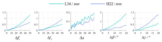 Exp. 4: Investigate the impact of camera calibration errors on the proposed method. Pose 1 was selected as the experimental subject, with the camera calibration results from the experiment serving as the ground truth. During the calibration process of T, different error amounts (, , , , ) were added to parameters , , , , and , respectively, to perform calibration and generate corresponding corrected images. Subsequently, measurements of L36 and H22 were extracted from these corrected images to evaluate the sensitivity of the proposed method to camera calibration errors. The experimental results are illustrated in Figure 16.