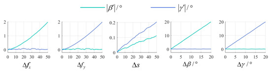 From the results, it can be seen that among the intrinsic parameters, errors in primarily induce , errors in mainly cause , and errors in simultaneously contribute to both and . But relatively speaking, the impact of intrinsic parameter errors on tilt residuals is relatively small. In contrast, within the extrinsic parameters, is almost equivalent to and nearly equals . Thus, it can be concluded that when the camera is well calibrated, extrinsic parameter errors become the dominant factor causing tilt residuals.
