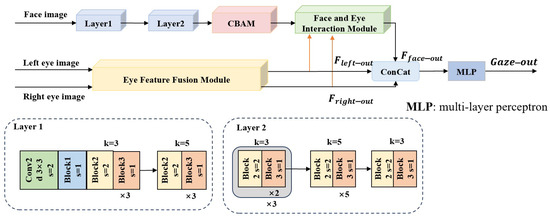 We developed an eye feature fusion module leveraging multi-head cross-attention; this facilitates interaction among eye features during the feature extraction phase. Additionally, we designed a facial feature interaction module that emphasizes features related to the eyes. Furthermore, we improved the channel attention mechanism by replacing maximum pooling with minimum pooling and incorporating a shortcut; this enable the model to focus more effectively on fine-grained details. This enhancement collectively contributes to improving the model’s performance.