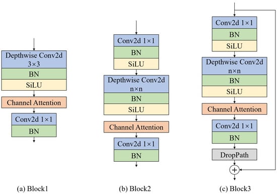 Based on Block1, Block2 adds a 1 × 1 convolution to adjust the number of channels, a BN layer to normalize the output of the convolutional layer, and the SiLU activation function. Based on Block2, Block3 adds DropPath and a shortcut connection. DropPath randomly drops some paths during training to mitigate the overfitting of the model.