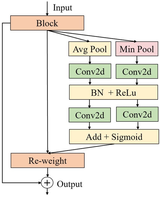As shown in Figure 4, the channel attention first undergoes average pooling and minimum pooling operations. These two pooling operations calculate the average and minimum values of the input data on each channel, respectively, to generate two feature maps with C × 1 × 1 dimensions. The convolutional layer is used to extract local features from the input data. Nonlinear activation functions introduce nonlinearity, and BN helps accelerate the training process and improve model stability. The sigmoid activation function limits the attention weights to between 0 and 1, facilitating subsequent weight allocation. Finally, a shortcut connection is used to prevent the loss of important information.