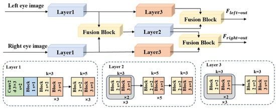 The eye feature extraction process and the eye feature fusion module (EFFM) are shown in Figure 5. First, low-level features are extracted from the input left/right eye images through the Layer1 convolutional layer. Then, the fusion block (FB) shown in Figure 6 is responsible for fusing the features of the left and right eye images, thereby utilizing the complementary information provided by both eyes. This is crucial for improving the accuracy and robustness of image processing.