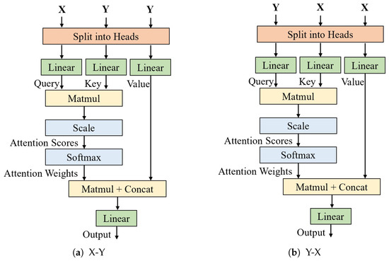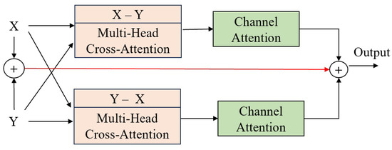 The input to the FB comprises two features, X and Y, which are fused using multi-head cross-attention mechanisms and channel attention. The multi-head cross-attention mechanism combines cross-attention and multi-head attention mechanisms, as shown in Figure 7. It calculates the attention weights X-Y and Y-X between the two different inputs, capturing the interaction information between the two features, using multiple heads to capture features from different subspaces. Then, weights are assigned through channel attention, and the result is fused with the shortcut connection of X and Y.
