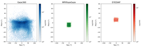 We summarize the three publicly available gaze estimation datasets—Gaze360, MPIIFaceGaze, and EYEDIAP—in Table 1. The distribution of gaze directions for these datasets is shown in Figure 9.