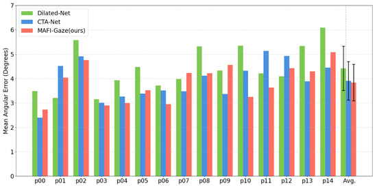As shown in Figure 10, we conducted a comparative analysis of gaze estimation errors across individual subjects in the MPIIFaceGaze dataset. The experimental results reveal two key findings: (1) MAFI-Gaze achieves superior accuracy, outperforming Dilated-Net in 11 out of 15 subjects (73.3%) and surpassing CTA-Net in 8 cases (53.3%), demonstrating robust performance despite significant inter-subject appearance variations; (2) stability is improved, with MAFI-Gaze exhibiting the smallest standard deviation (0.75) compared to Dilated-Net (0.91) and CTA-Net (0.79), suggesting better consistency in handling diverse facial characteristics.