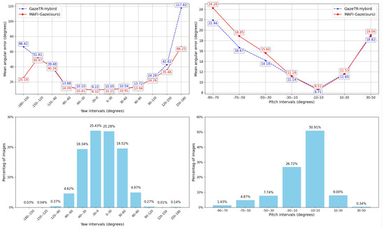 We compared the average angular errors of MAFI-Gaze and GazeTR-Hybirdacross for different gaze angle ranges on the Gaze360 dataset, as illustrated in Figure 11. The results reveal the following observations: (1) In the yaw direction, MAFI-Gaze achieves lower errors than GazeTR-Hybird for large angles (e.g., 90–180 degrees); however, such samples constitute a small proportion of the dataset. In contrast, MAFI-Gaze underperforms GazeTR-Hybird in the remaining angular ranges (−90 to 90 degrees). (2) In the pitch direction, MAFI-Gaze outperforms GazeTR-Hybird in the range of −10 to 10 degrees, and such samples account for more than 50% of the total samples. In other angular ranges, GazeTR-Hybird performs better than MAFI-Gaze. In summary, MAFI-Gaze excels in large yaw angles and small pitch angles but falls short in other ranges. On the other hand, GazeTR-Hybird delivers more consistent performance across most angular ranges, particularly in medium yaw angles and large pitch angles.