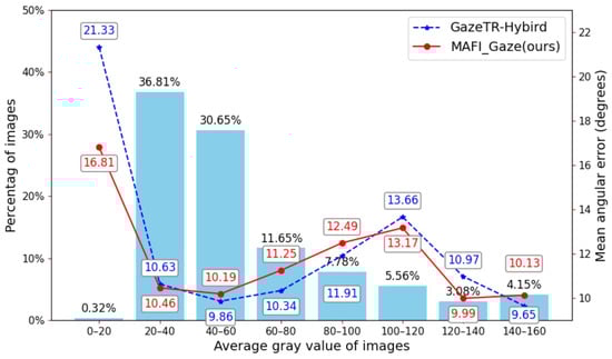 In addition, as shown in Figure 12, we calculated the average gray value of images on the Gaze360 dataset and compared the corresponding average angular errors. The average gray value represents the average intensity of all pixels in an image, where a higher value (closer to 255) indicates a brighter image. In comparison, a lower value (closer to 0) indicates a darker image. The average gray value is a simple and intuitive metric suitable for quickly assessing the overall brightness of an image. By analyzing the impact of image brightness on prediction performance, we observe the following: (1) Within the average gray value range of 20–40, which contains the largest proportion of samples, MAFI-Gaze achieves lower errors than GazeTR-Hybird; (2) within the range of 40–100, GazeTR-Hybird outperforms MAFI-Gaze; (3) in darker or brighter environments (extremely low or high gray values), MAFI-Gaze demonstrates better performance than GazeTR-Hybird. However, in the intermediate brightness range, GazeTR-Hybird exhibits superior performance.