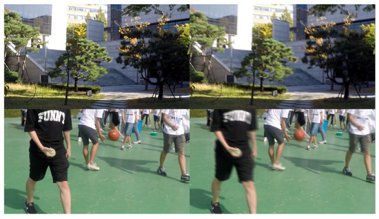 4] created the GOPRO dataset, which consists of 3214 pairs of sharp and blurred images captured at a resolution of 1280 × 720 pixels. Of these, 2103 pairs were used for training and model development, while the remaining 1111 pairs were reserved for model evaluation. We evaluate the performance of our proposed network by comparing its performance with those of state-of-the-art methods using the GOPRO dataset. Additionally, we assessed the network’s performance both with the GOPRO dataset alone and with the inclusion of our dataset (