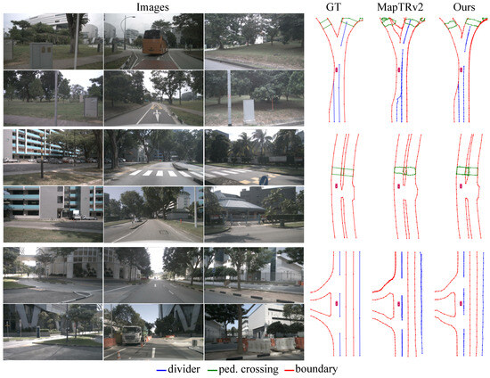 - Liu, Y.; Yuan, T.; Wang, Y.; Wang, Y.; Zhao, H. Vectormapnet: End-to-end vectorized hd map learning. In Proceedings of the International Conference on Machine Learning, PMLR, Honolulu, HI, USA, 23–29 July 2023; pp. 22352–22369. [Google Scholar]