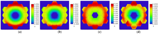 For the sub-mirror Y-direction decenter, similar to the X-direction decenter, four sub-mirrors with different Y-positions, A2, B1, B2, and C1, are selected respectively, and when the sub-mirror Y-direction decenter error is 2.5 μm, the RMS of the system’s WFE is 0.0317λ, 0.0585λ, 0.1354λ, 0.1766λ, respectively, where the C1 has the largest influence on the RMS of the system’s WFE.