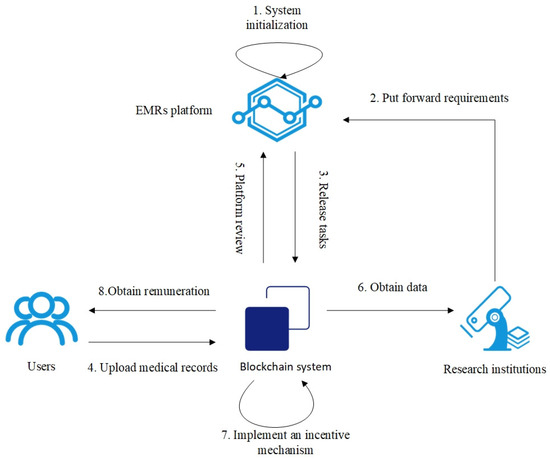 (4) Blockchain system: It stores the addresses of users’ Electronic Medical Records, records transactions, and implements the incentive mechanism through smart contracts.