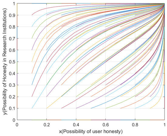 As shown in Figure 6a, users’ willingness to be honest increases with the increase in the reward coefficient, but if the reward coefficient is too low, users’ willingness to be honest may gradually decrease to 0. Figure 6b further confirms the positive effect of the increase of the reward coefficient on users’ willingness to be honest. Comparing Figure 6a and Figure 6b, we find that lower punishment coefficients may lead to users’ tendency to be dishonest. Nevertheless, even with a lower reward coefficient, users tend to be honest over time after an initial decline in their willingness to be honest. This suggests that an increase in the penalty coefficient is more effective than the reward coefficient in preventing users from being dishonest.