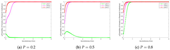 The user’s willingness to upload honestly is set to 0.5, and the initial confidentiality willingness of research institutions is set to three different levels from low to high, i.e., . When adjusting P, the impact on the evolutionary outcomes for research institutions with different initial willingness to keep secrets is explored.