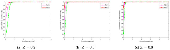 In this study, we set the research organization’s willingness to keep secrets as medium level, i.e., . Based on this, we classify user honesty willingness into three levels, namely, low (), medium (), and high (), in order to cover all stages of user honesty willingness. Further, this study adjusts the probability Z of the EMRs platform to detect repeated uploading behaviors of users to explore the results of user behaviors evolving under different initial willingness levels.