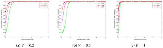 The research institution’s willingness to keep secrets is set to 0.5, and the user’s willingness to be honest is set to three levels from low to high, i.e., . On this basis, we adjusted the reward coefficient V to explore the differences in user evolutionary outcomes under different levels of initial honesty willingness.