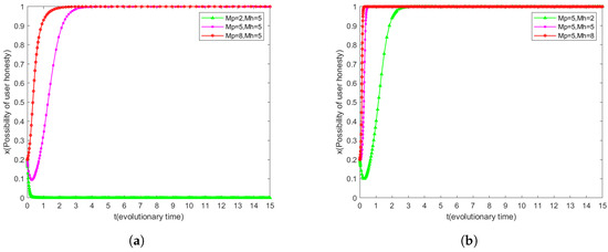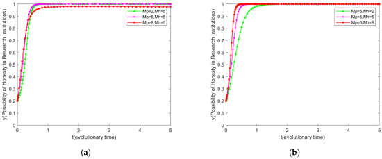 Comparing Figure 3a,b, it can be seen that when , . Research institutions have a different evolutionary path compared to those at . In the initial evolutionary stage, their willingness to evolve tends to be honest, but when the evolutionary time is about 0.2, their willingness to act reverses and tends to be malicious. This trend continues to evolve over time, and eventually, the research institution’s willingness may be completely inclined towards malicious behavior. This suggests that P has an effect on the behavior of research institutions to some extent, but if P is not high enough, the incentive it provides may not be sufficient to support the full evolution of research institutions towards honest behavior.
