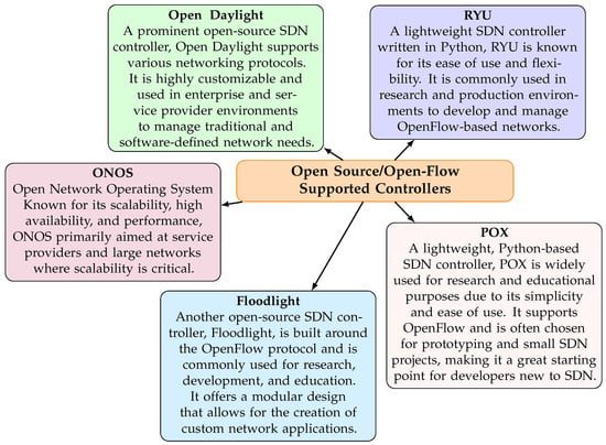 - Das, D.; Sahoo, B.; Roy, S.; Mohanty, S. Performance Analysis of an OpenFlow-Enabled Network with POX, Ryu, and ODL Controllers. IETE J. Res. 2024, 70, 8538–8555. [Google Scholar] [CrossRef]