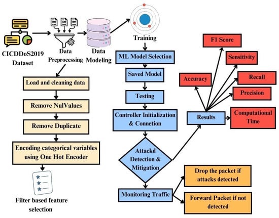 This section presents a systematic approach to identify and prevent distributed denial of service (DDoS) attacks in a software-defined network with machine learning techniques, depicted in Figure 3. First, we present the benchmark dataset used to train the machine learning models. Secondly, we present data preprocessing techniques, machine learning models, and an evaluation of the results at the end of the section.