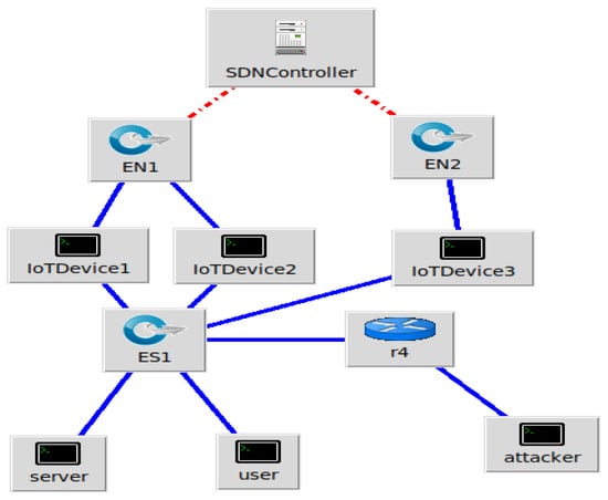 We use Mininet (Stanford, CA, USA) for implementation to test the effectiveness of machine learning techniques for real-time attack detection and mitigation in SDN. Using the CICDDoS2019 dataset, we integrate machine learning models and Mininet to simulate networks as shown in Figure 5. We explain the threat prevention techniques incorporated into our SDN-based architecture. The SDN controller instantly isolates or blocks the attack by dynamically updating flow rules when it detects a malicious traffic flow. Automated flow table updates are used to do this, blocking questionable IP addresses or unusual traffic patterns to stop further spread. Rate limitation is also used to reduce the danger of distributed denial-of-service (DDoS) attacks by controlling excessive bandwidth from possible attackers. The system uses anomaly-based policy updates for adaptive security, which enables the ML model to improve detection tactics gradually. By ensuring that threats are not only recognized but also actively eliminated, these mitigation techniques enhance network resilience and preserve service continuity. We train and test each well-known machine learning algorithms one at a time using hyper-parameter tuning with GridSearchCV, utilizing 5-fold stratified cross-validation. We used a Windows 10 computer with a 64-bit CPU and 12 GB of RAM and Ubuntu 20.04 as the guest operating system in Oracle’s Virtual Box to set up the experimental environment. We use Mininet and POX controllers on Ubuntu. The POX SDN controller is an open-source controller for OpenFlow/SDN that runs on Python 3.5, and a Mininet that supports OpenFlow 1.3 use in a virtualized environment. We created custom topologies using Python code, while MiniEdit makes it easier to create virtual network topologies. In Table 5, the setup specifications are shown. Mininet investigates numerous networking topologies, and POX SDN provides effective network administration. Actions based on the prediction of the machine learning model are part of the mitigation procedure in the script supplied for the POX controller. The script drops malicious packets to reduce an attack’s impact when detected.