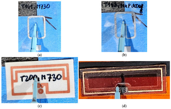It should be noted that the TT components were originally developed as ready-made UHF RFID tags, commercial products designed for operating in very close proximity to the read/write device (RWD). According to the Talkin’Things’ intentions, these transponders were not intended for use in the RFIDtex or RFIDLIG devices. However, they were repurposed as microelectronic modules for the present investigations, which aimed to validate the proposed assumptions. In contrast, the module designed by the authors is an electronic circuit especially elaborated for the conducted experiments, and it cannot operate as a standalone transponder.