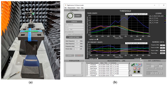 Laboratory stand for measuring read range of RFIDLIG transponders: (a) stand in anechoic chamber; (b) Voyantic Tagformance Pro software tool.