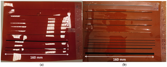 By adjusting the laser parameters and refining the method of fixing the Kapton substrate to the laser’s working table, seventeen test samples with conductive graphene paths were successfully prepared (Figure 5).